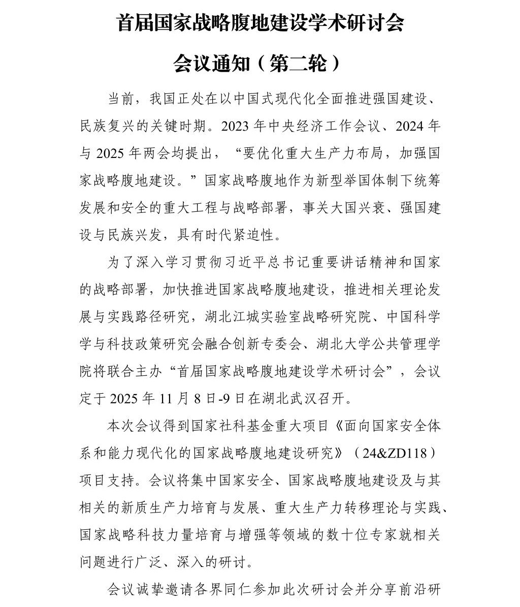 【研讨会二轮通知】首届国家战略腹地建设学术研讨会通知