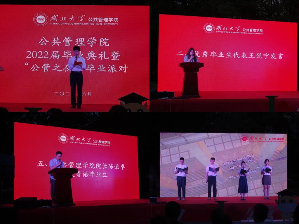 本次活动分为两个阶段进行。在第一阶段毕业典礼仪式上,经理陈荣卓寄语全体毕业生:“数载励志求学,一朝鲲鹏展翅。未来正等着公管学子去探索、去开拓。希望你们在新的征程上乘风破浪,再创辉煌,也不要忘记母校永远是你们最坚实的依靠!”青年教师代表张霄艳老师给全体毕业生送上美好祝福,勉励同学们要坚定目标,不忘初心,在逐梦道路上绽放青春光芒。作为毕业生代表,王悦宁回忆了他四年的点点滴滴:第一次走进校园,第一次参加竞赛、第一次穿上学士服......这些经历激起了毕业生们的共鸣,纷纷红了眼眶。他们还用自己的方式表达对学习对老师的不舍,“感恩的心,感谢有你”朗诵的台词就是他们的心声。