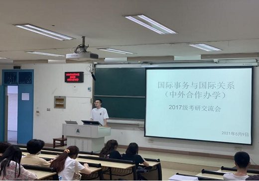 5月9日,国际事务与国际关系(中外合作)专业2018级、2019级的同学们在四号教学楼召开考研交流会。拟录取为武汉大学研究生的甘睿劼就为何考研、如何合理择校、如何规划学习计划、如何制定学习目标等问题向现场同学进行了详细讲解;拟录取为中国科学技术大学研究生的周雨萌向同学们介绍了各科的复习技巧,建议同学们劳逸结合,注重复习效率。对于如何选择出国留学服务机构、如何准备留学申请材料等方面,拟录取为伦敦国王公司研究生的关心仪分享了个人的心得体会。