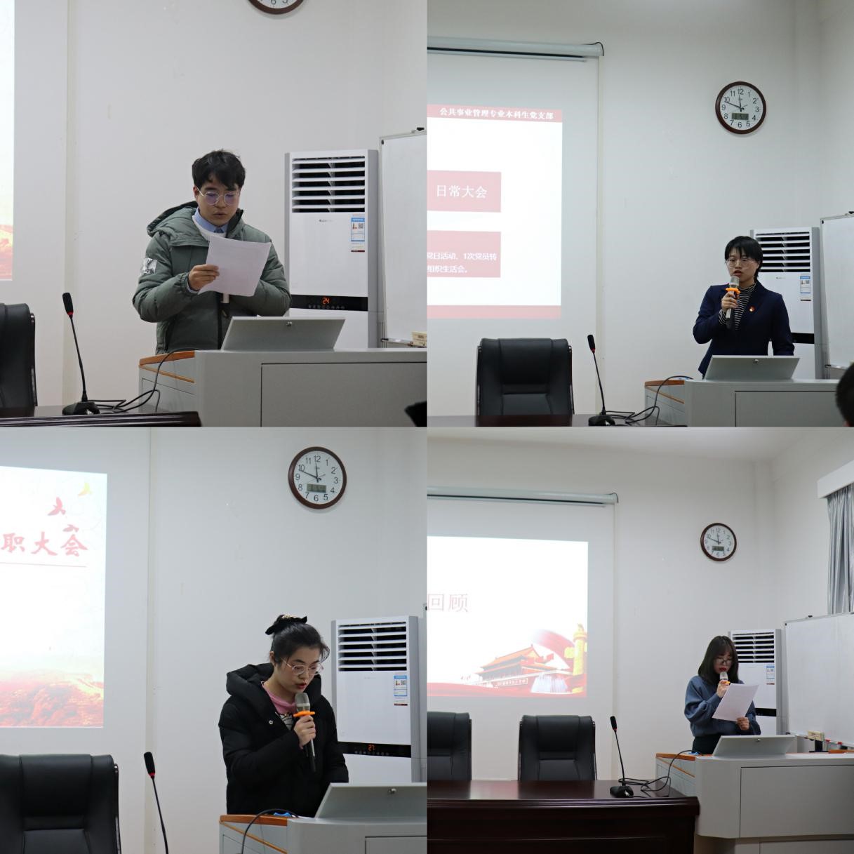 各支部书记从支部基本情况、支部特色及亮点、自身存在的问题和原因、下一步工作计划及措施等方面进行了汇报。公共事业管理本科生党支部副书记曹艳勤介绍了支部2020年开展的各项活动情况,在2021年将进一步创新支部活动,计划通过“以优异党建答卷迎接中国共产党成立100周年”系列主题党日活动、献礼百年华诞的校内采访和参观学习等方式庆祝建党100周年。研究生第五党支部组织委员刘海燕分享了支部创建“学习型”党支部的过程,积极动员研究生党员发挥科研优势,以学带行,以行促学的实践探索以及支部创建取得的初步成效。研究生第一党支部书记张敬苓向我们展现了支部多名党员同志下沉社区、志愿服务的优秀事迹。
