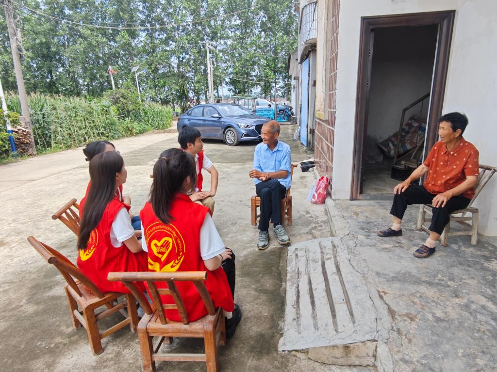6月24日,团队成员前往荆门市沙洋县李市镇蒋台村。首先举行了庄严的宣誓仪式,新老党员共同重温入党誓词,完成了一场跨越半个世纪的精神接力。随后,团队成员通过走访老党员、采访革命前辈,了解革命先辈的伟大精神。在交流中,在党50周年的老党员胡家亮同志深情回忆了自己1970年入党的经历:“那时候入党没有预备期,组织上考察了我三年才批准。现在的年轻党员要珍惜来之不易的入党机会,永远听党话、跟党走。”随后,在与村庄儿童的交流活动中,志愿者们通过讲述红色故事、开展知识问答等活动,在孩子们心中播撒下红色的种子。