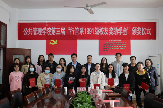 张小进副经理宣读《关于授予陈珍等15名同学2020年“行管系1991级员工奖助学金”的决定》。员工周新敏、李荣娟、周鸿雁依次为获奖员工颁奖。